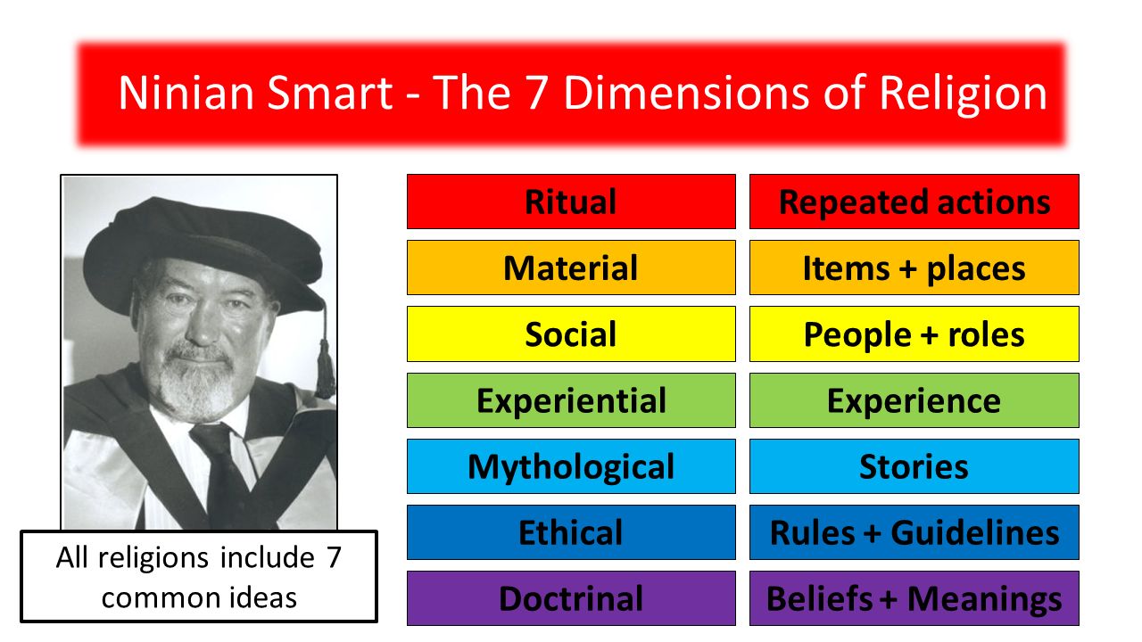 Ritual experiential & emotional narrative & mythical doctrinal ethical social material to help Euthanasia tony bland activity francis o'callaghan. 24/07/2013 · the 7 dimensions of religion was a concept developed by ninian smart. Ritual experiential & emotional narrative & mythical doctrinal ethical social material to help Introduction to religion and popular culture mark wheller. It was a way of defining the different world religions, but allowing them be compared, based on 7 key elements:
